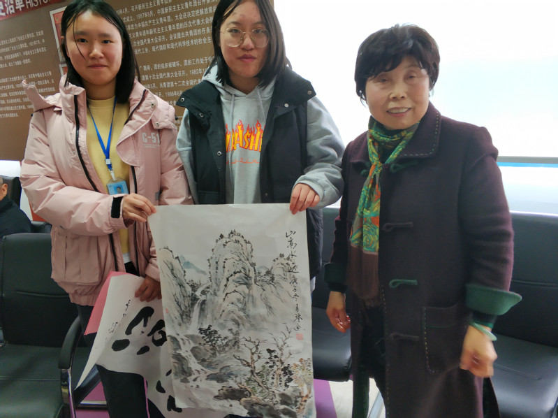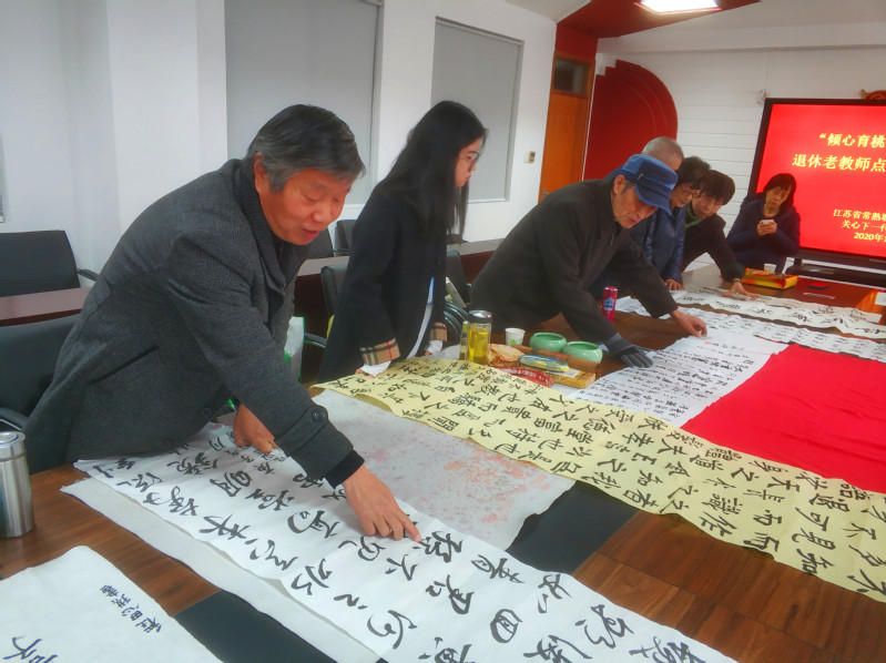 书画笔会过程中,苏建青校长来到现场看望老教师,对书画组退休老教师回校创作作品馈赠学校表示衷心的感谢。苏建青校长、吴国清副校长兴致勃勃地观看创作,欣赏作品,和老教师们亲切交流。老教师代表朱成煜、顾月琴向学生赠送了书画作品,勉励他们要勤学多练。
