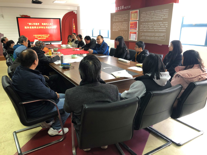 书画笔会第一阶段,首先组织了“倾心育桃李,笔墨写人生”学生书法作品点评会。吴国清副校长作了讲话,他感谢退教协对学校关工委一直以来的关心和支持,特别是书画组退休老教师们发挥自己的特长,弘扬传统文化,经常回校指导学生,帮助学生提高书画水平。学生们带来了自己临摹和创作的作品,老教师认真地一一为他们点评,指出其中的优点和不足,提出了今后的学书方向。