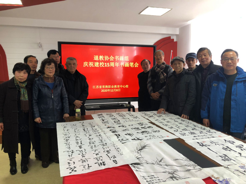 12月8日上午,学校庆祝建校15周年书画笔会在行政楼七楼东会议室举行。学校退教协书画组邓恩楠、朱成煜、李长华、尤育皋、李莲珍、顾月琴、李国良、苏再庆8位退休老教师挥毫泼墨,用书画笔会的形式,庆祝学校成立15周年。校长苏建青、副校长吴国清、退教协会理事长朱振国、工会副主席徐月芳、学生工作处副处长秦卫刚和学生书法爱好者代表参加了本次活动。学校退管会副主任钱立新主持书画笔会。