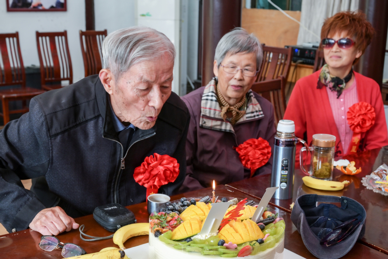 接着庆生仪式开始,寿星们胸佩大红花、神采奕奕,全场齐唱《生日快乐》歌,两位90岁寿星吹蜡烛许心愿,大家分享祝寿大蛋糕。
